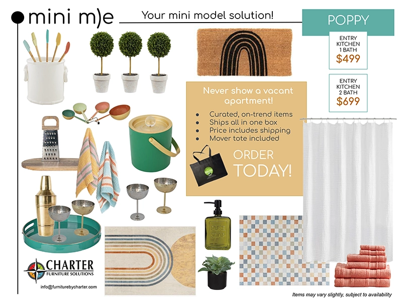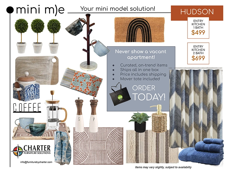 These days, whether showing a vacant apartment in person or virtually, it is important for it to look it's best! Our mini model program includes just the right amount of apartment essentials to improve the look of vacant apartments. By adding these items to the front entry, the kitchen and the bathroom, your prospect will connect more with the apartment and be able to visualize living in the space.
